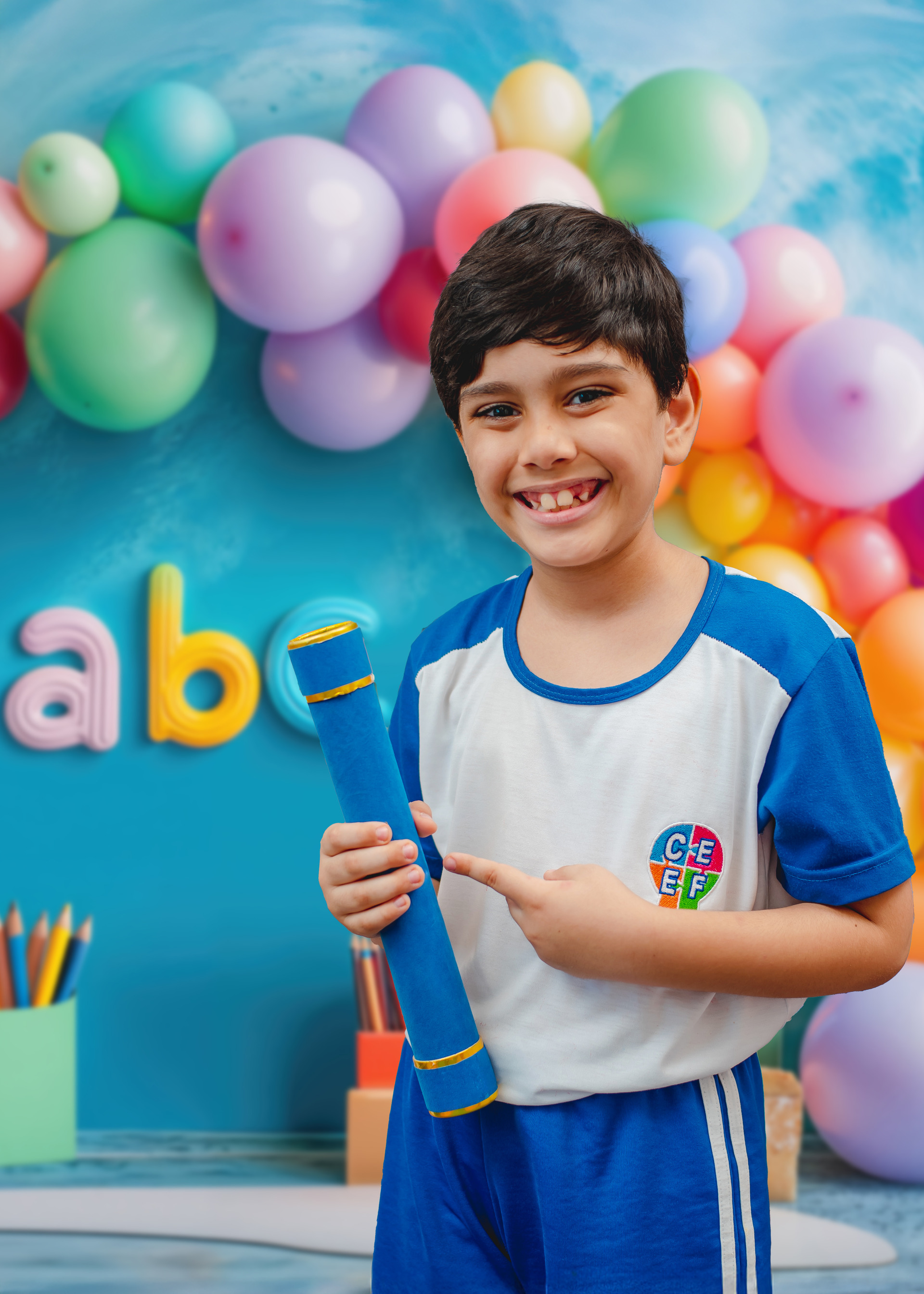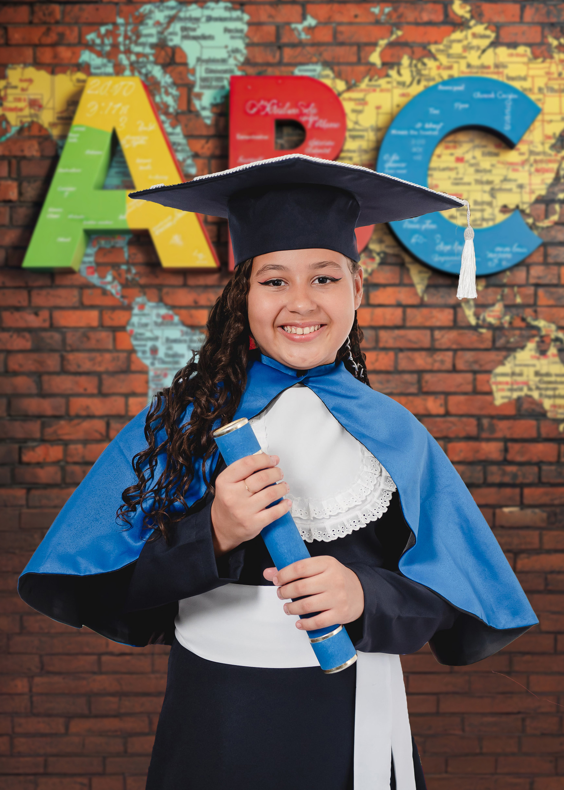 - Montamos a estrutura de estudio em uma sala disponibilizada pela escola para fazer as fotos individuais dos alunos. Nesse momento, faremos fotos com a beca, canudo e cadeira de formatura e fotos de farda em um fundos temáticos.